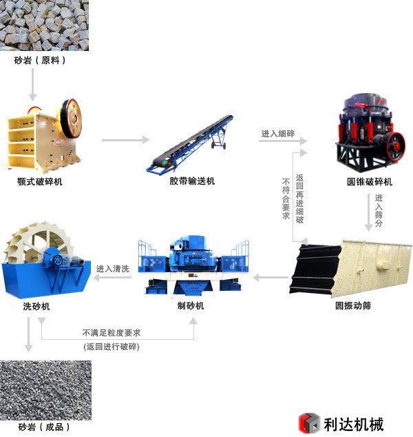 4、最終,進制砂機的花崗巖一部分制成砂,經洗砂機清洗后制成制品砂。洗砂環節可依據用戶的出產要求和質料狀況進行挑選。